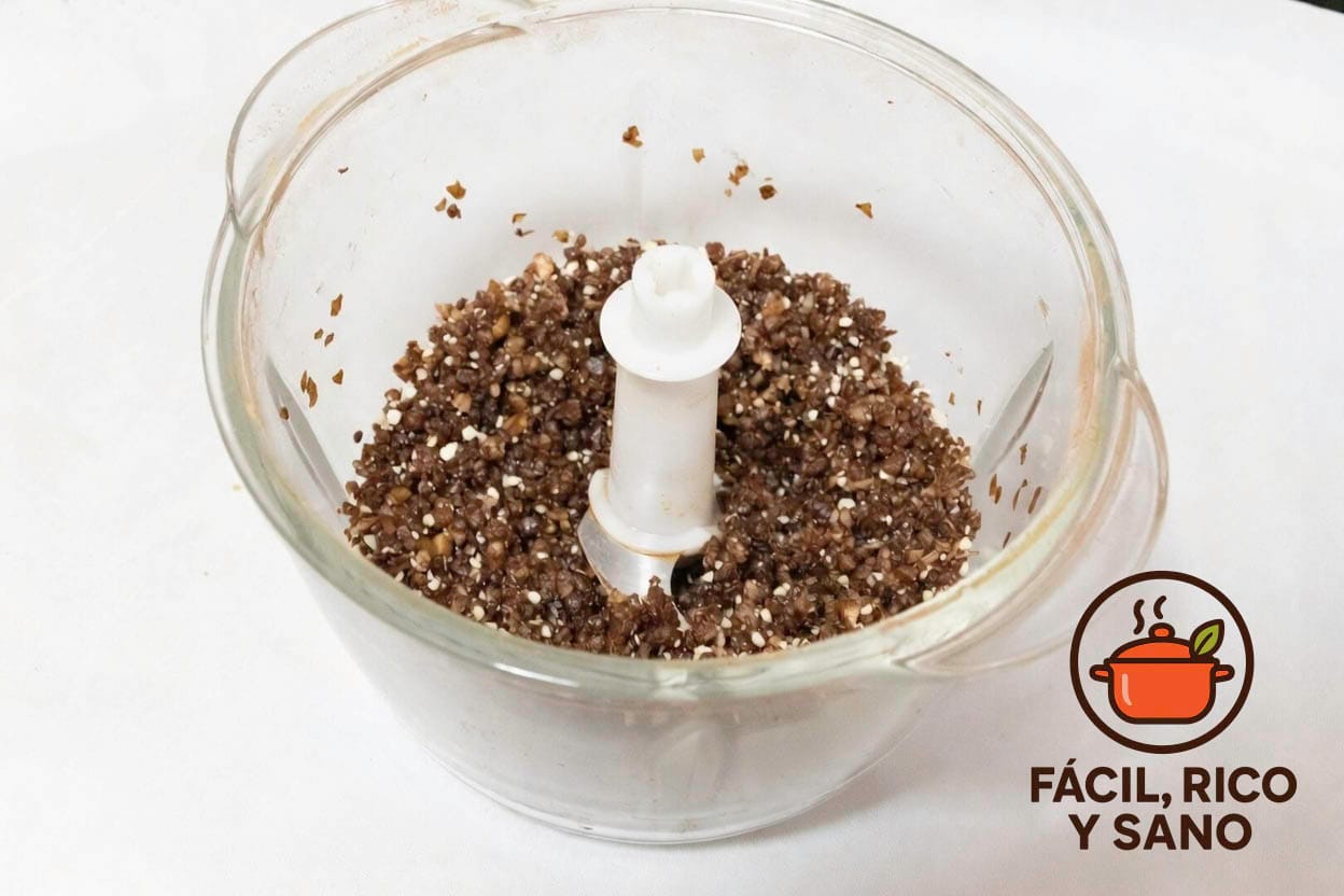 - Quitamos los huesos a los dátiles y ponemos todos los ingredientes en frío en una picadora o batidora de vaso, trituramos bien hasta formar una pasta.