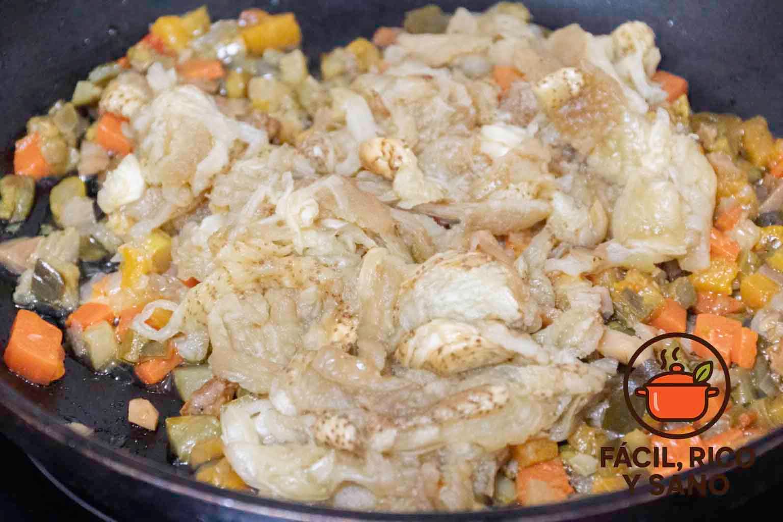 Mientras tanto, cortamos todas las verduras en trozos pequeños y las cocinamos en una sartén con 1 cucharada de aceite de oliva.