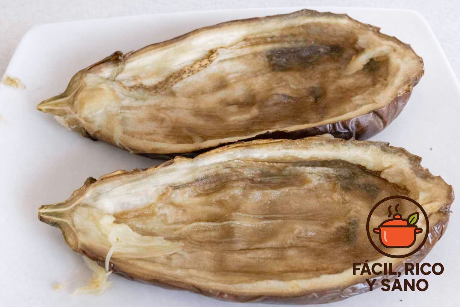 Sacamos la berenjena del horno, la abrimos y retiramos la pulpa con cuidado usando una cuchara.
