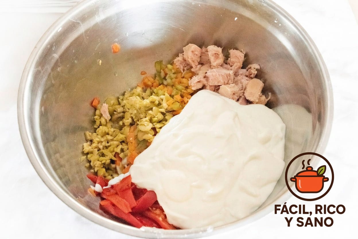 Escurre bien la macedonia de verduras.Pica las aceitunas y corta los pimientos del piquillo en tiras o dados.Escurre el atún y desmenúzalo.