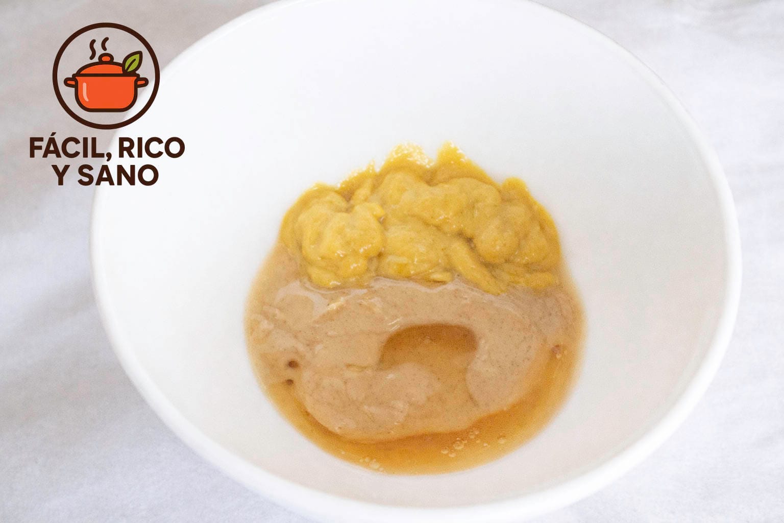 - Preparar el aliño de tahini: En un bol pequeño, mezcla la cucharada de tahini, la mostaza y la miel. Remueve enérgicamente hasta obtener una crema homogénea. Si queda muy espesa, puedes añadir una cucharadita de agua tibia.