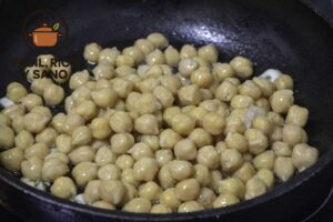 - Saltear los garbanzos: En otra sartén (o en la misma si retiras la berenjena), saltea los garbanzos cocidos con un diente de ajo picado y un hilo de aceite de oliva hasta que cojan temperatura y el ajo esté dorado.