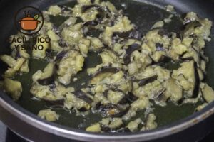 - Pochar la berenjena: Corta la berenjena en medias lunas finas. En una sartén o cazuela con un chorrito de AOVE y una pizca de sal, cocínala a fuego lento. El secreto está en la paciencia: deja que se haga bien hasta que esté casi desechándose y muy tierna.