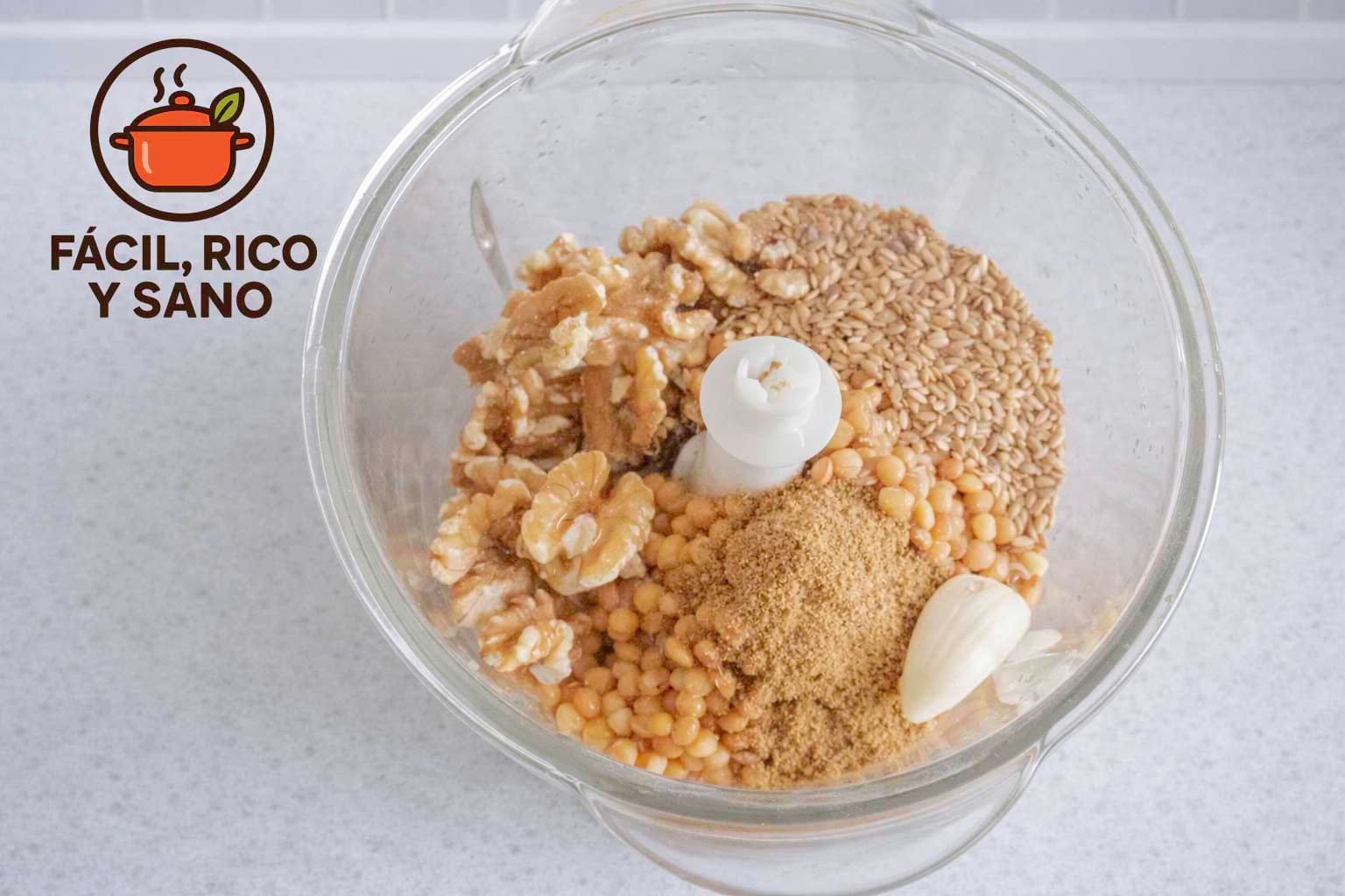 Procesamos las lentejas cocidas (bien escurridas) con las nueces y el sésamo. Buscamos una mezcla homogénea que combine la fibra de la legumbre con la cremosidad de la semilla.