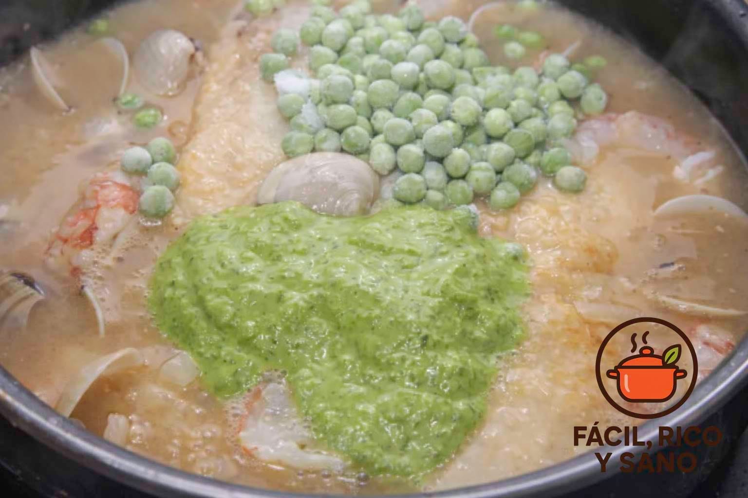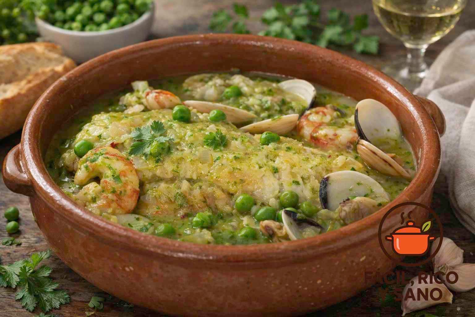- Integra el caldo y perejil:Vierte el caldo casero colado. Tritura un buen puñado de perejil con un chorrito de caldo (o pícalo muy fino). Añádelo a la olla. Cocina 5 minutos para que los sabores se unan.Añade gambas, almejas y guisantes:Incorpora las almejas lavadas, los gambones pelados y los guisantes. Cocina tapado 5 minutos hasta que las almejas se abran (desecha las que no se abran).