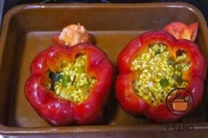 Lava los pimientos rojos, corta la parte superior y retira las semillas. Rellénalos con la mezcla hasta ¾ de su capacidad (el arroz integral se expande menos que el blanco). Coloca las tapas y ponlos en una fuente de horno.