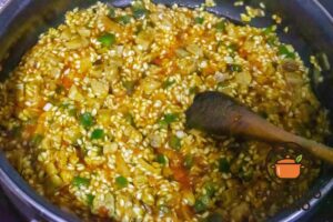 Aquí puedes hacerlo de dos maneras:– El arroz integral necesita más hidratación y más tiempo que el arroz blanco.– Puedes elegir entre remojarlo o cocinarlo más tiempo en el sofrito.Opción A (más rápida): remojo previo Remoja el arroz integral 1 hora en agua. Escurre y añade al sofrito.Opción B (sin remojo): cocción más larga Añade el arroz integral directamente y cocina 15 minutos con el sofrito antes de rellenar.En ambos casos: Añade el azafrán y el caldo caliente (aprox. 200–250 ml). Cocina a fuego medio hasta que el arroz esté a media cocción y haya absorbido buena parte del caldo.
