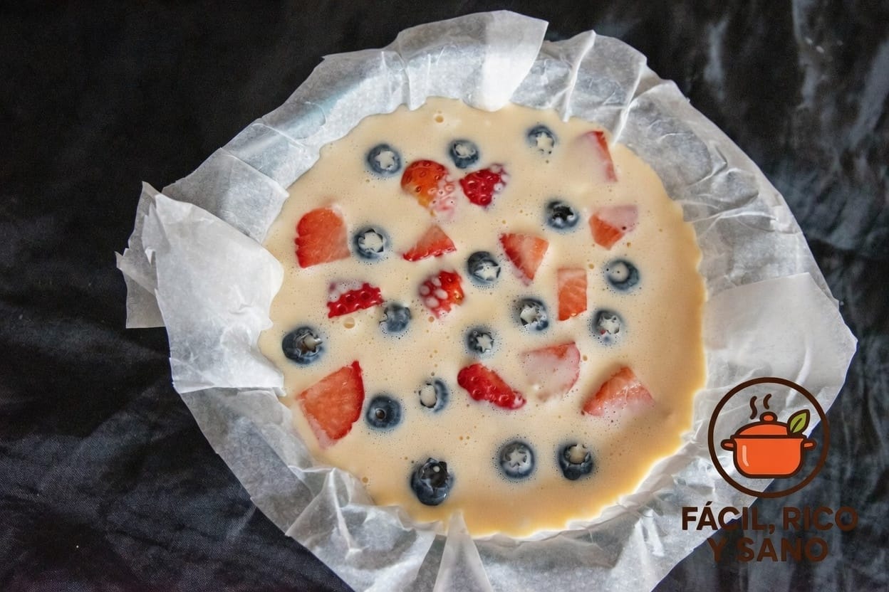 - Montaje: Vierte la mezcla sobre la base y distribuye los frutos rojos troceados por encima de forma uniforme.