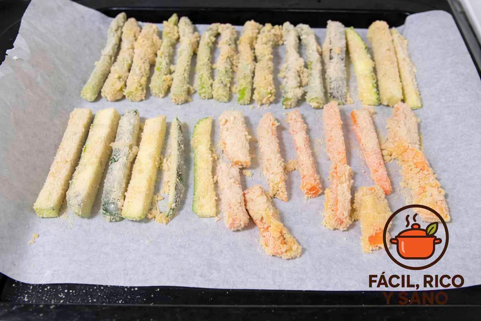 - Comienza cortando la verdura en bastones. Añádeles un poco de sal, pásalos por huevo y pan rallado, y ve colocándolos sobre una bandeja de horno cubierta con papel vegetal.